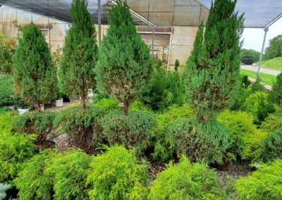 Magnolia, Weeping cherry, Weeping red bud, Golden Falls, juniper, Topiary juniper, Planet Earth Arborvitae, Grey Guardian Juniper